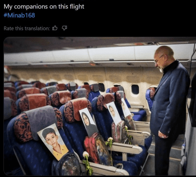 The photograph at right tells even the casual observer that Iran is entering the next round of negotiations with the United States with its eyes wide open while holding the ultimate trump card… The Strait of Hormuz. The Iranians are shrewd masters of information operations and their skill is on display in this photo… The first 168 seats in the plane are adorned with a photograph of each of the students who were killed by the US missile strike on February 28. The negotiators have not forgotten nor have they forgiven the United States for this heinous act.