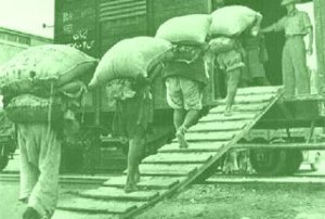 Iranian workers are forced by occupying troops to load their own requisitioned trains during the Second World War.