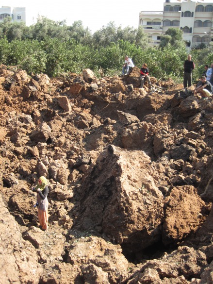 The Israeli Air Force fired a missile into a Beit Hanoun residential neighborhood in north Gaza early Sunday morning. The missile landed in a grove surrounded by homes, creating a crater the size of a tennis court and destroying over forty orange and olive trees. Chunks of shrapnel and oranges lay scattered about the grove.