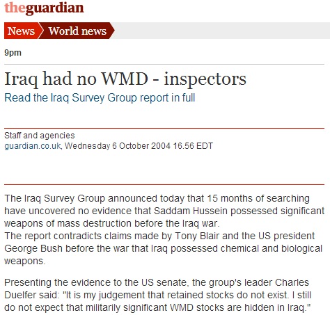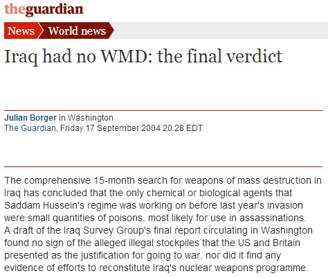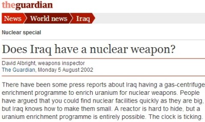 As FAIR reported at the time, even before the Powell address there were reasons to be skeptical of the administration’s claims. On February 4, 2003, FAIR published “Iraq’s Hidden Weapons: From Allegation to Fact,” which made the point that “it has not been demonstrated that Iraq continues to hold unconventional weapons.” FAIR criticized coverage like that of the New York Times (2/2/03), which asserted that “nobody seriously expected Mr. Hussein to lead inspectors to his stash of illegal poisons or rockets, or to let his scientists tell all.”