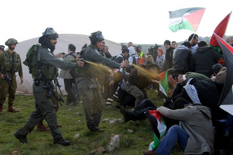 Israeli occupation forces routinely use an arsenal of live bullets, rubber-coated steel bullets, tear gas and skunk water against Palestinians, even during peaceful demonstrations. Palestinians protesters typically respond by throwing rocks and occasional molotov cocktails.