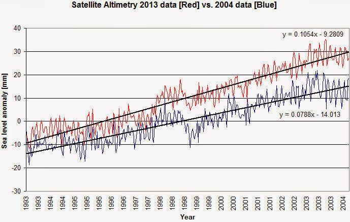 (https://web.archive.org/web/20040719102733/http://sealevel.colorado.edu/2004_rel1.2/sl_ib_ns_cu2004_rel1.2_global.txt) differs from the current one: (http://sealevel.colorado.edu/files/2013_rel7/sl_ns_global.txt) in a rather interesting fashion. Changes have been made to the data resulting in an increase in the rate of reported sea level rise by nearly a millimeter per year.
