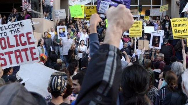 Hundreds of American demonstrators held a march in Albuquerque, New Mexico on Sunday to protest fatal shootings by the police, including the one that led to the killing of James Boyd, a homeless man who lived on the foothills of a mountain outside the city.