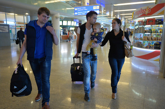 Zvezda TV channel correspondent Evgeny Davydov, center, with his family and sound engineer Nikita Konashenkov on their arrival at Moscow’s Sheremetyevo airport. (RIA Novosti/Alexey Kudenko)