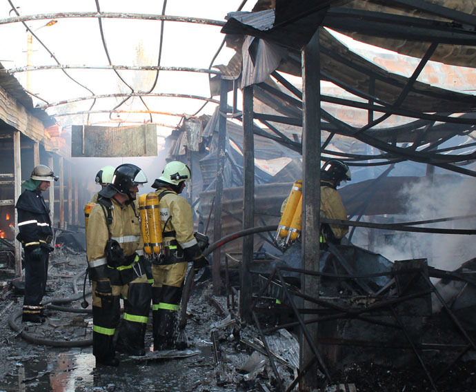 2637716 06/06/2015 Firemen extinguish fire at the Oktyabrksy market caused by a shell hit during the shelling of Donetsk. Irina Gerashchenko/RIA Novosti