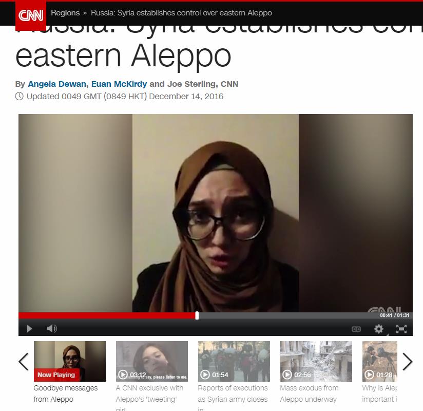 Finally, if you trace down the network of people behind these CNN and BBC “sources” you always arrive at a dark destination. On the surface of these people and their accounts we find the fake idealism embracing the dead and destroyed in Aleppo and elsewhere in Syria. Underneath, down the trail of collaborators and friends we find the AK 47s, the trenches and windows with snipers shooting at the real Syrian Army. There is no mistaking the “jihad” in the jihadist, in the revolutionary. I also find it ironic that Syria expert Vanessa Beeley talking with recently rescued citizens from East Aleppo revealed these White Helmet rescuers as phantoms, ghosts no trapped civilians there ever heard tell of.