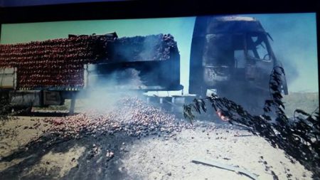 The remains of a truck hit by a Saudi strike in Hudaydah Province, Yemen, March 16, 2017.