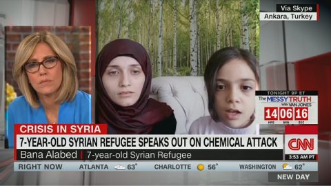 Under the title, “7-year-old Syrian girl’s heartbreaking plea: ‘Why can’t you stop the war?’,” CNN anchor Alisyn Camerota is seen interviewing a 7-year-old Syrian girl named Bana Alabed.