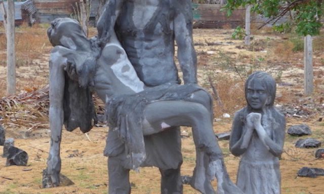 An eerie art installation near an idyllic Sri Lankan beach symbolizes many of the contradictions of this post-war society, comprising a sculpture of a man carrying his brutalized daughter, an old suitcase full of clothes and a small ‘graveyard’ punctuated by tiny stones.