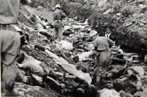 July 1950 U.S. Army file photograph once classified “top secret”. S. Korean soldiers walk among thousands of political prisoners shot at Taejon, S. Korea.