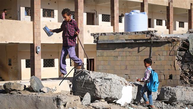 Yemeni children walk outside a school that was damaged in a Saudi air strike in the southern Yemeni city of Ta’izz. (By AFP)