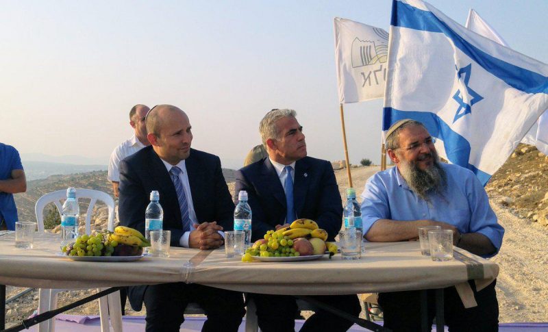 Yair Lapid (centre) and Naftali Bennett (left) joined settlers on 23 July 2017 at the inauguration of a monument that was rebuilt in the illegal settlement outpost of Netiv HaAvot after the Israeli Supreme Court ordered the outpost’s demolition and the evacuation of all settlers [Yigal Dilmoni/Twitter]