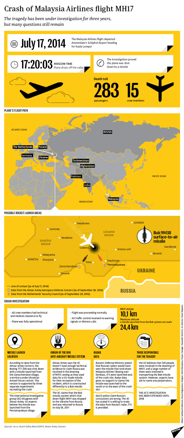 Kiev blamed the crash on the Donbass independence fighters, who countered by saying they did not have the means to bring down an aircraft flying at such a high altitude. An inquiry by Dutch investigators concluded that the Boeing was shot down by a Buk missile system, which it alleged was delivered to the militia from Russia and then sent back. Moscow slammed the inquiry’s bias, saying that the investigators’ conclusions were based exclusively on information received from the Ukrainian side. A separate investigation by Almaz-Antei, maker of the Buk system, concluded that the Boeing was shot down from territory controlled by the Ukrainian military.