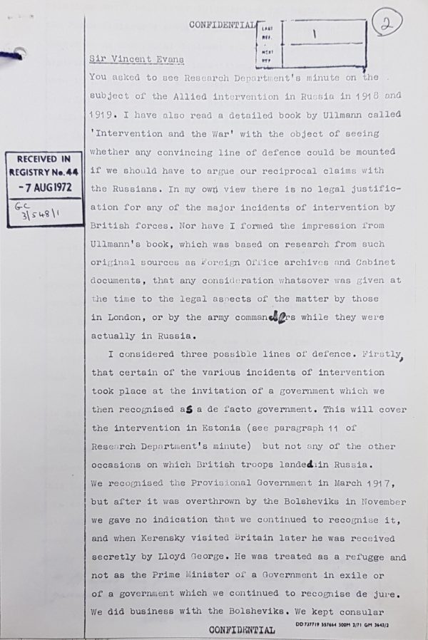 FCO Legal Councellor paper on legality of British intervention in Russia