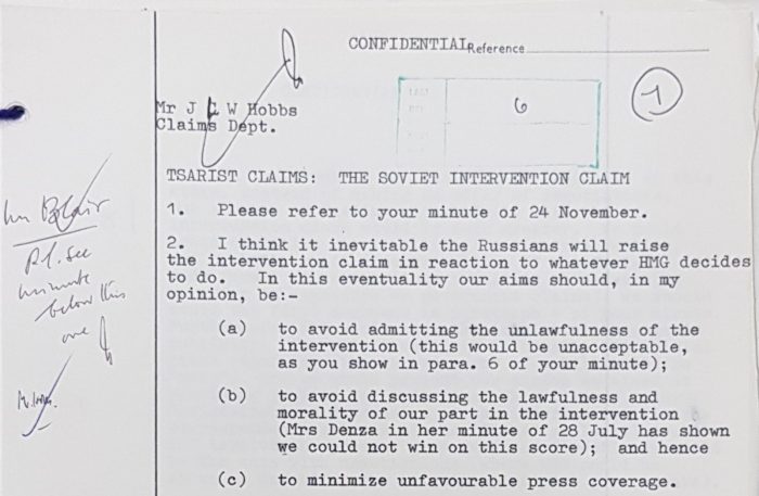 “The question of defence of British property was never raised or put forward at any stage,” wrote the FCO legal counselor, “and it had always been clearly understood that it was intervention which led the Bolsheviks (who began by being friendly to Britain) to take much more extremist measures against property generally and to adopt the position that no compensation would ever be paid to the Allies in respect of their expropriated property, since it was the necessity caused by external pressures and Allied intervention which had made it necessary to seize foreign property on such a scale.”