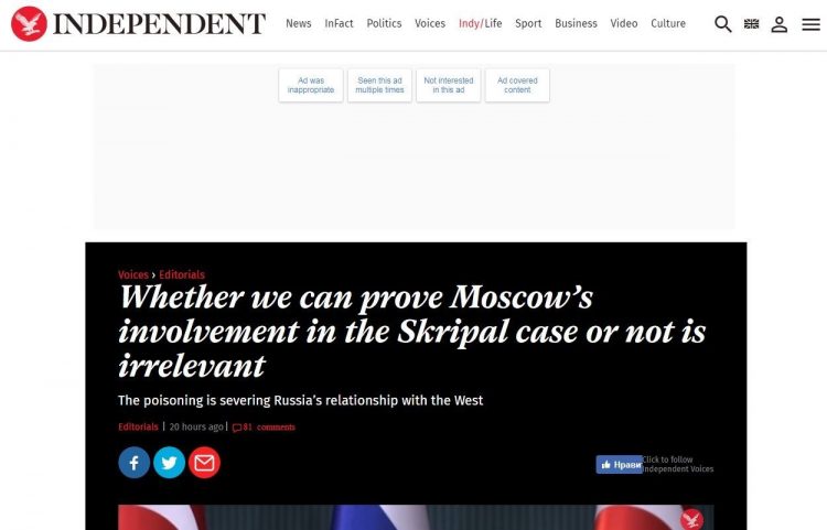 Some outlets, including The Independent, decided to meet Aitkenhead’s revelations with a stiff upper lip, insisting that Russia’s efforts in the Skripal case, including its “ever more reasonable-sounding but insincere offers” to help in the investigation, don’t change “the overwhelming probability that the novichok nerve agent originated in Russia…” It is simply “inconceivable that anyone other than the Russians” could organize such a plot, according to the newspaper.