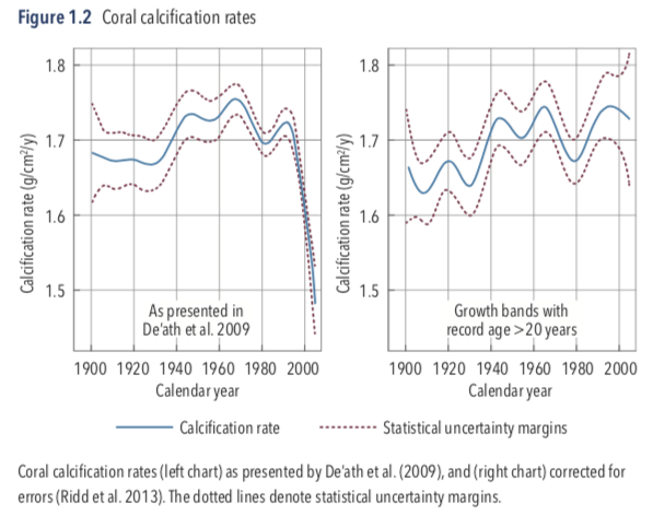 However, I have two issues with their analysis. I published my concerns, and an alternative analysis, in the journal Marine Geology (Ridd et al. 2013). First, there were instrumental errors with the measurements of the coral layers. This was especially the case for the last layer at the surface of the coral, which was often measured as being much smaller than the reality. This forced an apparent drop in the average calcification for the corals that were collected in the early 2000s – falsely implying a recent calcification drop. Second, an ‘age effect’ was not acknowledged. When these two errors are accounted for, the drop in calcification rates disappear, as shown in Figure 1.2.