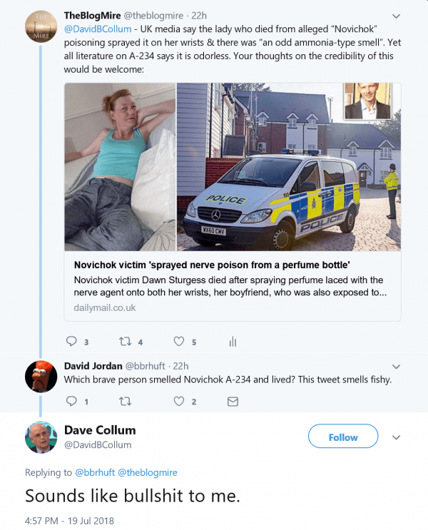 From a purely logical point of view, I understand that this is all complete and utter nonsense. But I do wish I’d paid more attention in chemistry classes at school so I might at least be able to debunk it from that point of view. But alas it was not to be. However, since I know nothing about that side of things, I thought I’d ask someone who does. David Collum is a world-renowned Professor of Chemistry and Chemical Biology at Cornell University, with a PhD, MS and MA from Columbia University, and a BS from Cornell. I asked him what he thought of the claim being made in the UK media that Dawn Sturgess was poisoned by “Novichok” and this gave off an “an odd ammonia-type smell”. His answer, which I will leave you with, whilst not what you might call eloquent, was certainly to the point: