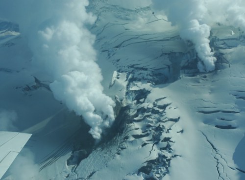 Figure 1.) Volcanic gas emissions breakthrough overlying fractured and partially melted glacial ice sheet. (Image credits: Christina Neal, AVO/USGS)