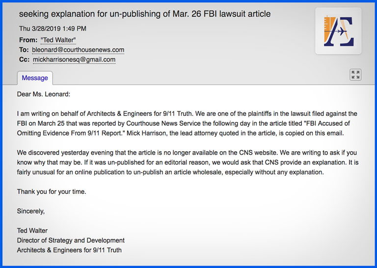 The second extraordinary action came the following day, at around 6:00 PM Eastern, when Courthouse News apparently pulled the article from its website. This happened to coincide with the time that Architects & Engineers for 9/11 Truth sent a bulletin to its email list, sharing the refreshingly unbiased coverage with thousands of supporters — except that thousands of supporters were directed to a dead link.