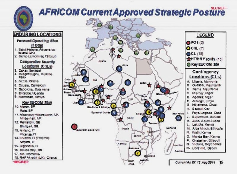 AFRICOM map of Africa, published by The Intercept (12/1/18). Note that in the Pentagon’s doubletalk, the US does not have “permanent bases” in Africa—it has “enduring locations.”