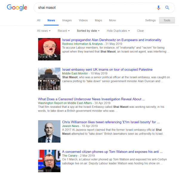 A Google news search reveals that not one single mainstream media outlet has mentioned Shai Masot in 2019. Not even once.