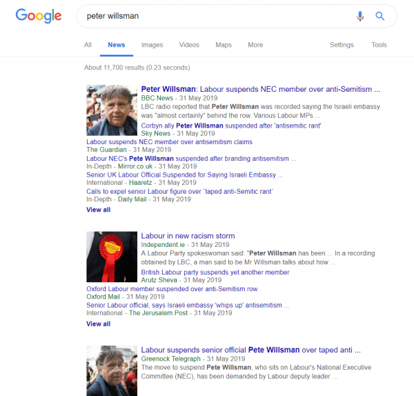 Yet the main political news story the last two days has been the suspension of Labour’s Peter Willsman for “anti-semitism” for making the suggestion that the “anti-semitism” witch-hunt is promoted by the Israeli-Embassy. This has been demonstrably a massive story: