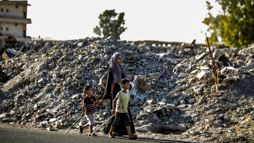 A woman and two children walk past debris in the northern Syrian city of Raqa, the former Syrian capital of the Islamic State group, on August 21, 2019. © AFP / Delil SOULEIMAN