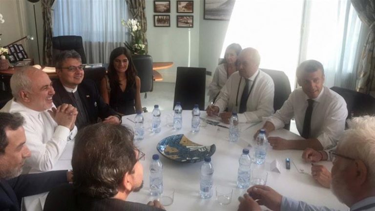 Iran’s Foreign Minister Javad Zarif (L) held talks in Biarritz on Sunday Aug. 25, 2019 with France’s President Macron (R) and Foreign Minister Jean-Yves Le Drian.