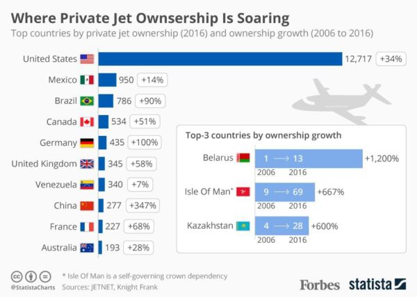 The top 50 countries in the world in terms of private jet ownership have a total fleet of nearly 18,000 jets. According to Statista, private jet ownership is soaring in most developed countries (as wealth inequality accelerates thanks to central bank interventions and 10 years of Cantillon Effects).