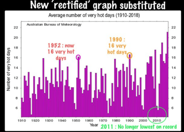 From Down Under, a member of the federal House of Representatives named Craig Kelly — a member of the Liberal Party, which is conservative — has caught that nation’s Bureau of Meteorology altering graphs showing the number of very hot days so as to obscure the fact that 1952 had more of them than recent years and adding a newly “discovered” hot day to a more recent year to make it appear that they are increasing.