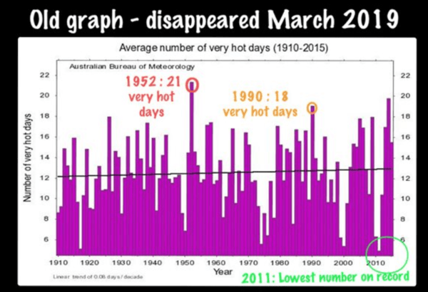 Not only did the Bureau’s graph showing the year 1952 as having the highest ‘number of very hot days’ (and the year 2011 with the lowest number) disappear down a memory hole — but a new ‘rectified’ graph has appeared in another section of their website.