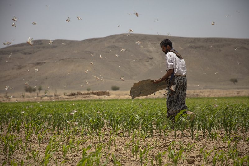 A Yemeni farmer tries to chase locusts off of his fields. Photo | UNFAO