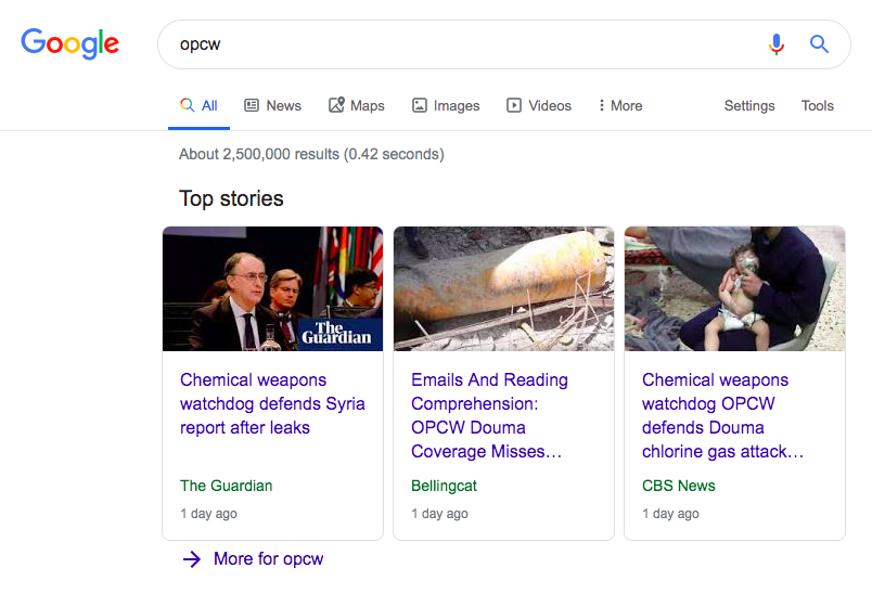 Google has helpfully made sure to place Bellincat’s assertive-sounding gibberish at the very top of news results which come up if you do a search for “OPCW” today: