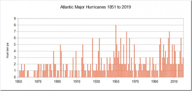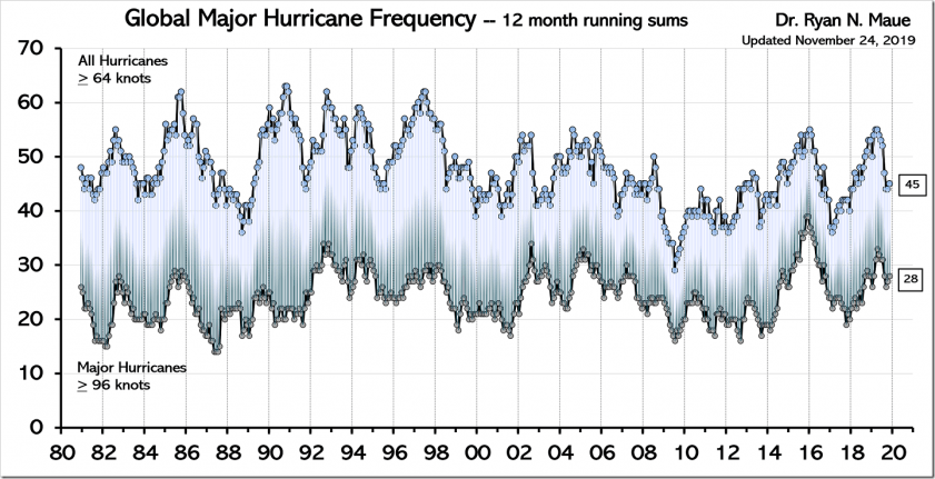 Globally, 12-month running averages indicate nothing out of the ordinary, either for all hurricanes or major ones: