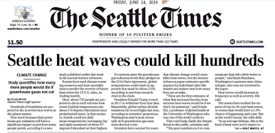 The Seattle Times is one of the worst offenders. I can provide a few dozen example of fear-mongering headlines, completely adrift from the truth. Like the June story claiming heat waves will claim hundreds of lives (actually 725) for each heat wave later in century (see below). It was complete nonsense, with extreme assumptions about warming rates and assuming no one would buy an air conditioner.