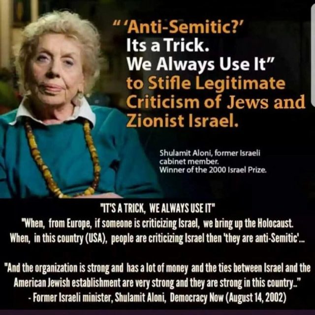 The Israelis and, to be sure, many diaspora Jews know exactly how the expression has been weaponized. Former Israeli Minister Shulamit Aloni explained how it is done: “Anti-Semitic . . . It’s a trick; we always use it.”
