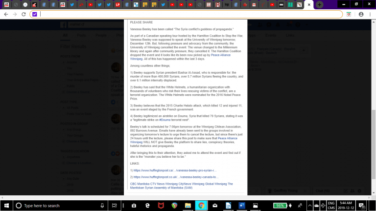 Beeley’s talk is scheduled for 7:00pm tomorrow at the Winnipeg Chilean Association, 892 Burrows Avenue. Emails have already been sent to the groups involved in organizing tomorrow’s lecture to urge them to cancel the lecture, but since there’s just 24 hours until the lecture, please share this post to make sure that Peace Alliance Winnipeg WILL NOT give Beeley the platform to share lies, conspiracy theories, hateful rhetorics and propaganda.