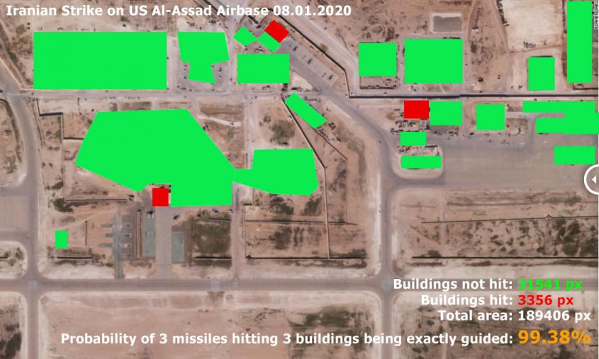 The key idea is really simple and understandable for anybody who has thought about statistics (even in an everyday context). In number terms, it’s almost like rolling dice and getting a 6 three times in a row, because the probability of rolling a 6 with an ideal dice is 16.67% (and the probability to roll 3 sixes in a row is less than 1%) as opposed to roughly 18% probability for a hit on a building within the map area in the CNN screenshot (if we assume the missiles to be unguided within this area). To be even more precise, the probability for hitting 3 *different* buildings 3 times in a row is actually even slightly lower than 0.62%, as one would have to substract the area being hit from the total area covered by buildings (I ignored that for simplicity). A less than 1% probability for a one-off event like this means that it is really highly UNlikely – to use the British Skripal case expression in its inverted state – to have happened randomly, as we assumed in our hypothesis. Which means that the missiles were, indeed, guided, and guided very accurately, striking targets of less than ~50m size with a high degree of reliability (in this particular area 3/3, in others probably 1/1 as in the runway case, etc). Perhaps, some of them, not covered by the satellite images, missed the target, but it does not substantially change the high degree of accuracy that potential Iranian opponents within reach of these missiles will have to assume from now on. The people most interested in this were probably the Israelis, as they are probably the main potential target for this type of missile in the case of a future escalation.