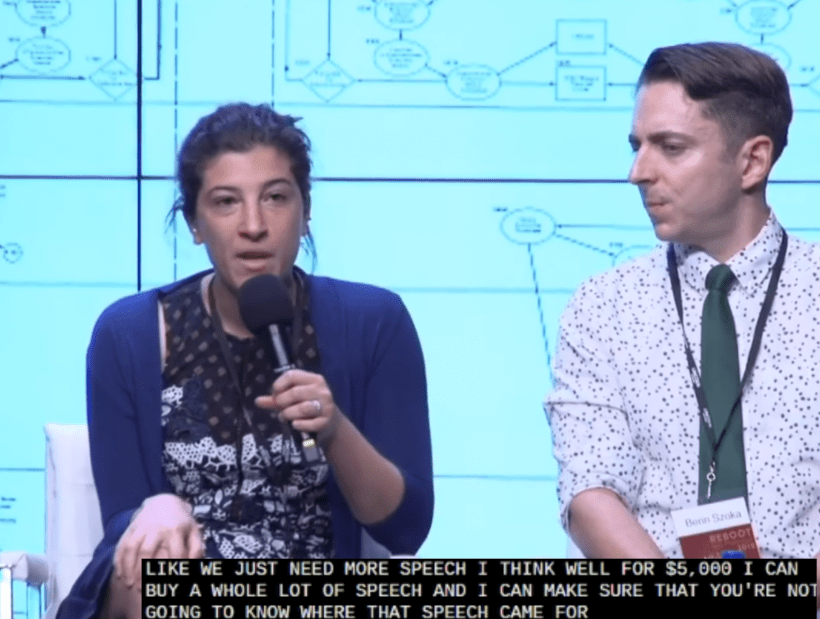 Like Stamos, DiResta has a history of distrusting online people-to-people networks. In September 2018, she appeared on a panel titled, “Is Social Media a Threat to Democracy? Fake News, Filter Bubbles, and Deep Fakes,” at which she blasted Twitter for enabling “more speech” with its autofill retweet function, noting that “for $5,000 I can buy a whole lot of speech.”