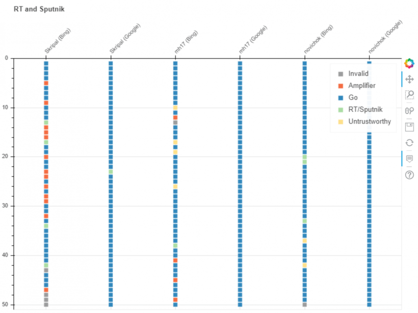 In another report in December 2019, the SIO faulted Microsoft default search engine Bing for failing to prune its search results as efficiently as Google does, specifically naming higher-ranked links to Sputnik and RT stories on search terms like “novichok,” “Skripal,” and “MH17” as a problem.