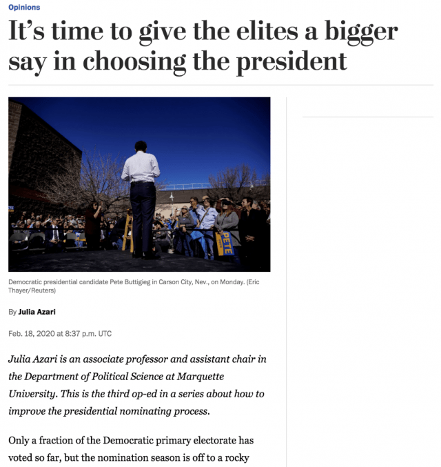 WaPo wants a bigger role for ‘elites’ in picking the president, & doesn’t even try to hide why » 5e4d6ca52030277df020f456