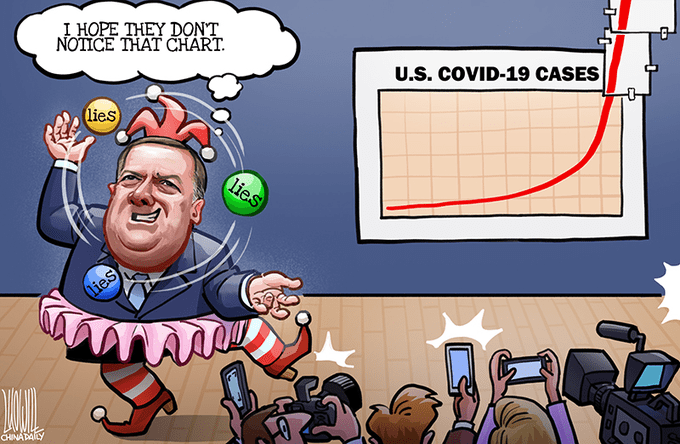 The paper also ran a cartoon showing Pompeo, outfitted as a jester, juggling “lies” as he tries to distract media attention from rising coronavirus cases in the US.