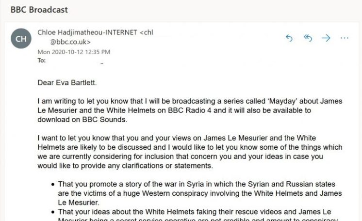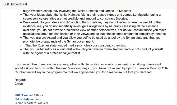 The British state-funded BBC, which has a history of perverted war propaganda against the people of Syria, a history of whitewashing the crimes of terrorists in Syria, a history of flat out lying about events in Syria, has decided to launch another smear against myself, Vanessa Beeley, researchers of the Working Group on Syria, a former ambassador to Syria, and others.