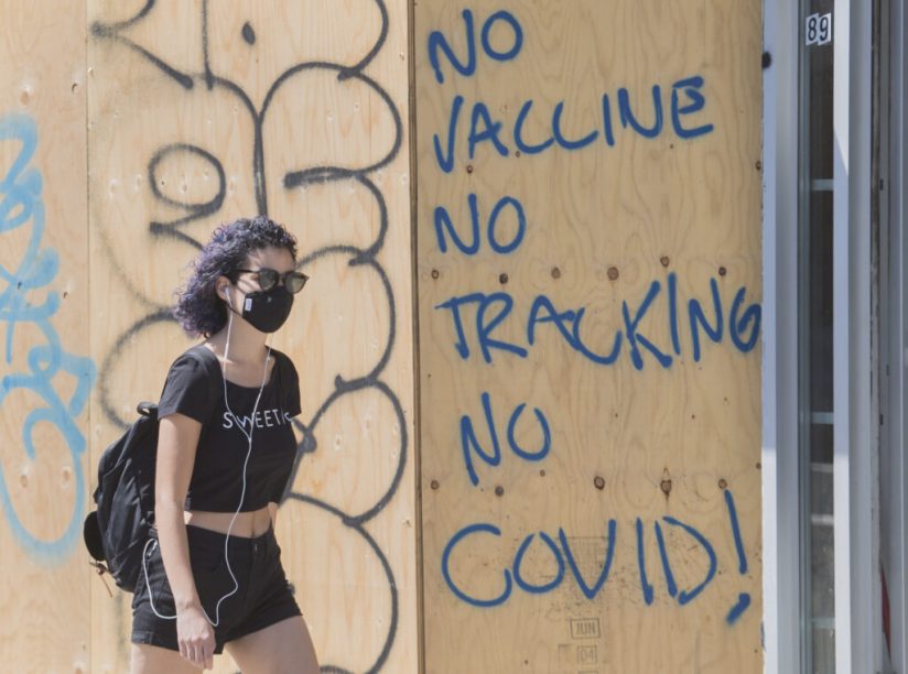 A woman passes by graffiti reading ‘No vaccine, No tracking, No COVID’, in Montreal, Sunday, August 16, 2020, as the COVID-19 pandemic continues in Canada. THE CANADIAN PRESS/Graham Hughes