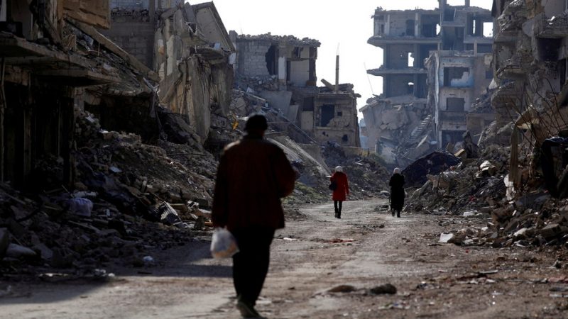 People walk past damaged buildings at the Yarmouk refugee camp on the southern outskirts of Damascus © Reuters