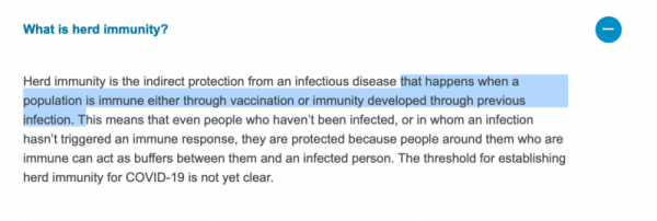 So that you will believe me, I will try to be as precise as possible. Here is the website from June 9, 2020. You can see it here on Archive.org. You have to move down the page and click on the question about herd immunity. You see the following.