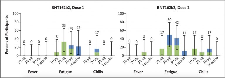 Of the 39 older people who received 2 doses of BNT about half of them experienced “fatigue,”roughly 15% had “chills” and 3 of them had a fever. The common side effects of BNT included nausea, headache (a very common BNT induced nervous system disorder) arthralgia and myalgia (very common), fatigue, chills and fever (again very common.) Other than fatigue, no one in the placebo group suffered these problems.
