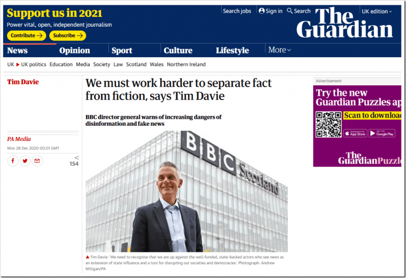 What Mr Davie is really saying, of course, is that we must all get our “news” from the BBC, and ignore other sources in case we discover the true facts.