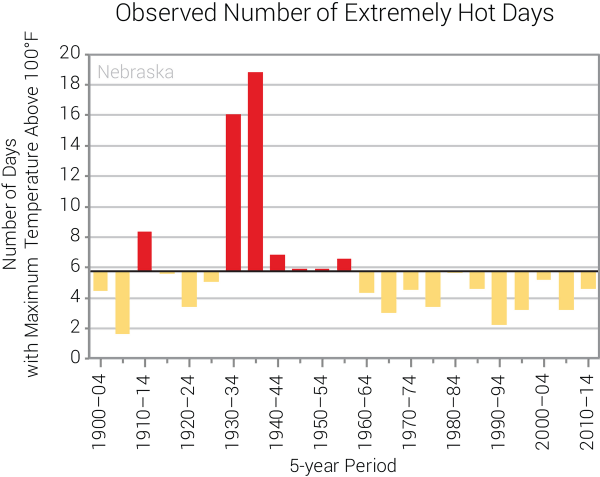 Also, NOAA data (see the NOAA chart below) show no increase in hot summer temperatures. Indeed, hot summer days were much more prevalent throughout the first half of the 20th century than has been the case in recent years and decades. This also contradicts any assertion of more Nebraska drought.